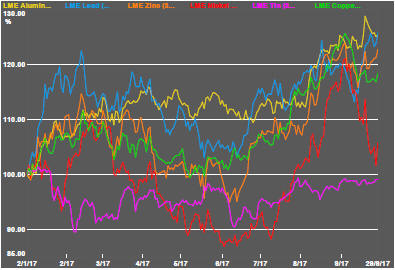 Nickel prices were noticeably weaker in the past week. The tin price showed little change. The balance of the LME complex of nonferrous metal prices remained near cyclical and 2017 high points.