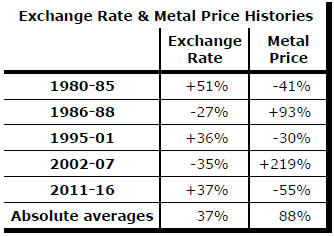 Over the course of the five cycles, average changes of 37% in the exchange rate have been associated with average metal price moves of 88%.
