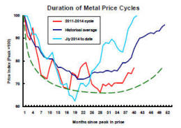 Using the prices of the six main daily traded base metals - aluminium, copper, lead, nickel, tin and zinc - the blue line in the chart shows, for the nine price cycles since 1960, the profile of the average adjustment following each cyclical price peak.