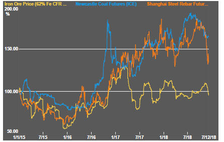 The weakening growth picture and the impact of US trade policies had put a dent in Chinese steel prices which had fallen dramatically in the past two weeks. Faced with this change in conditions, and the implied reduction in steel industry profitability, iron ore prices lost nearly 8% during the week.