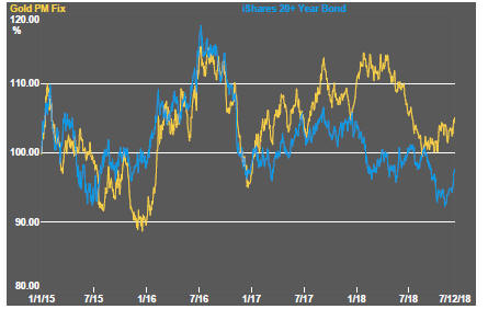 Higher bond prices supported stronger gold prices during the week. This technical connection should persist but the likelihood of a large upward movement in bond prices appears low presently. Gold had also been overpriced relative to bond prices, limiting the leverage of the precious metal price to a change in financial market conditions.