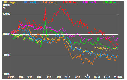 All the main London traded prices are now below the levels at which they started in 2018 with tin, for so long the laggard, now showing the best relative performance over the year to date.