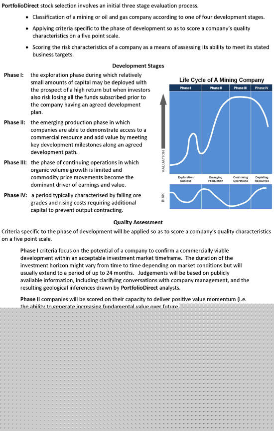 Companies already in production are rated against their ability to sustain value building activities without having to rely on favourable changes in the macro environment in which they operate.