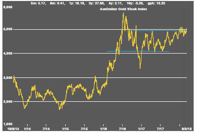 The prices of Australian gold related stocks have moved within a narrower range than their north American counterparts. Australian prices sit around the upper end of the range of outcomes over the past year. In contrast, North American prices are around the lower end of their range.