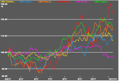 Daily traded nonferrous metal prices have lost momentum recently although nickel prices broke from the pack a week earlier to be the best performing of the metals during 2017. Tin prices have continued to lag.