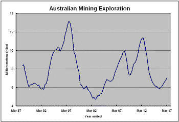 The Australian Bureau of Statistics (ABS) has reported that the number of metres of exploration drilling within Australia across existing and new mineral deposits rose by 22.3% over the year to the end of March 2017.