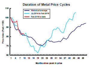 Evidence has mounted through most of 2018 of insufficient momentum to carry the cycle, dating from mid 2014, further. The timing of the directional change would not be unusual. More often than not, progress stalls this far into a cycle. Time, of itself, is not important but the sequence of adjustments which are typical of a commodity price cycle and contribute to changed prices and expectations does take time. A more detailed analysis of metal price cyclical duration is available here.
