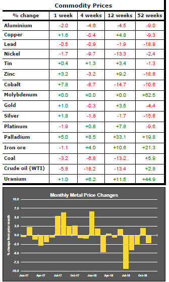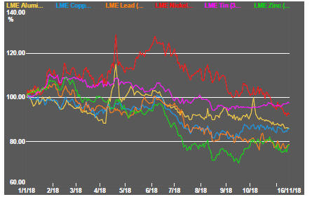 All the main London traded prices are now below the levels at which they started in 2018 with tin, for so long the laggard, now showing the best relative performance over the year to date.