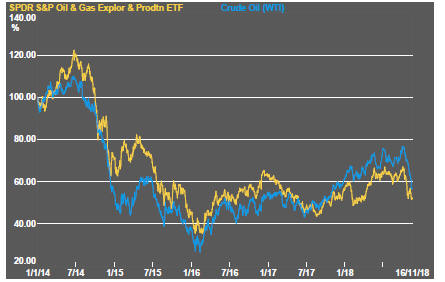 The prices of oil related equities have reacted negatively, as one would expect, to the weakening market conditions with added pressures coming from slumping equity prices during October. Not having responded strongly to the previous rise in crude oil prices, prices of oil and gas exploration and development stocks have shown limited downside leverage to the further weakness in crude oil prices in the past week.