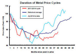 Using the prices of the six main daily traded base metals - aluminium, copper, lead, nickel, tin and zinc - the blue line in the chart shows, for the nine price cycles since 1960, the profile of the average adjustment following each cyclical price peak.