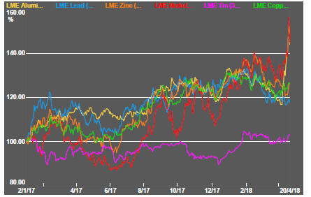 Prices of the main daily traded nonferrous metals had become increasingly correlated as a broadening consensus about the lowered risks to world economic activity emerged - until the new US sanctions against Russian business interests dramatically impacted aluminium and nickel prices.