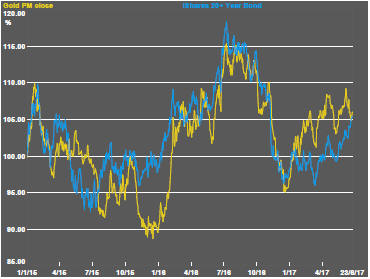 Gold prices fell in the past week although they have remained within a broad uptrend consistent with the rise in bond prices.