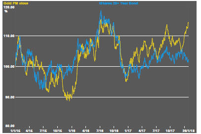 Despite weaker bond prices (which would normally detract from gold prices), gold prices have risen as one would expect with the downtrend in the US dollar.