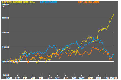 Interest rate impacts are also more evident with a widening gap between the share price performance of financial services companies which are thought to benefit from higher rates and real estate and utility prices which are less favourably impacted.
