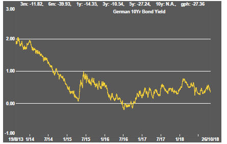 US government bond yields flicked higher but losses have been curtailed by the pursuit of safe havens during the equity sell-off. German government bond prices have benefited similarly with uncertainties over Italian budget policy being an additional factor influencing European capital flows.