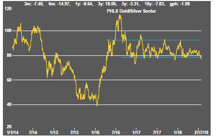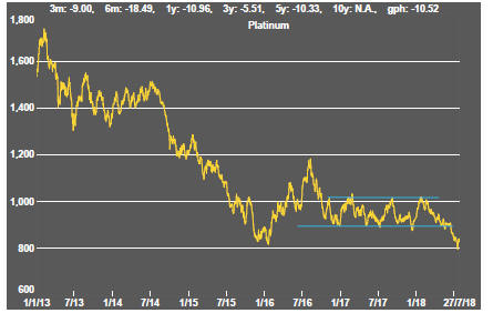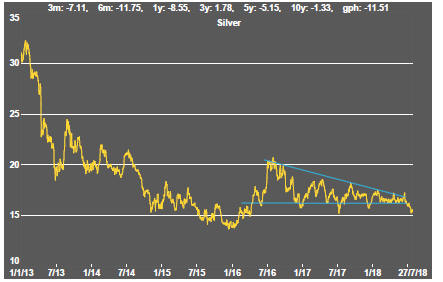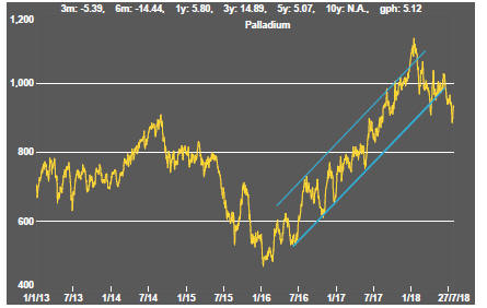 Gold and palladium price uptrends have been broken. Platinum prices fell below the lower bound of a two year trading range. Silver prices have proved the most resilient only by falling least.