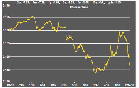 The most conspicuous move has once again come from the yuan, A move lower by the Chinese currency will give export oriented Chinese companies some breathing space against pressures from a tariff battle with the US government and may convey a warning to the US about how China might react to further tariff based measures by the USA.