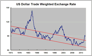 The chart illustrates the relationship using the International Monetary Fund metal price index (in the red line) and the US dollar trade weighted exchange rate (shown in blue). Since December 2011, the IMF metal price index has fallen 38% while the currency has risen 23%.