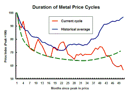Using the prices of the six main daily traded base metals - aluminium, copper, lead, nickel, tin and zinc - the blue line in the chart shows, for the nine price cycles since 1960, the profile of the average adjustment following each cyclical price peak.