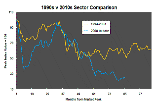 Sector prices have adjusted to the next level of support. The parallel with the 1990s is being tested. Prices will have to stabilise around current levels for several months for the thesis to hold.