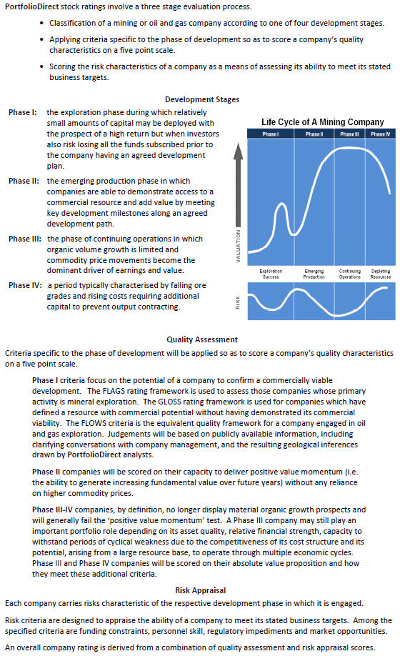 Companies already in production are rated against their ability to sustain value building activities without having to rely on favourable changes in the macro environment in which they operate.
