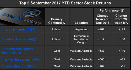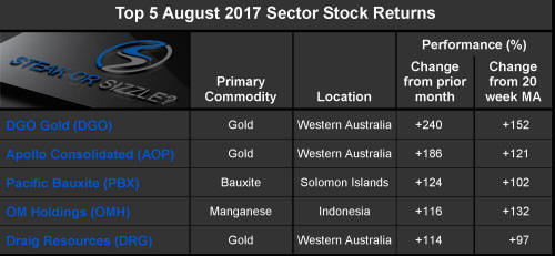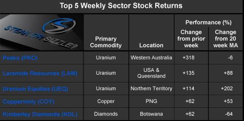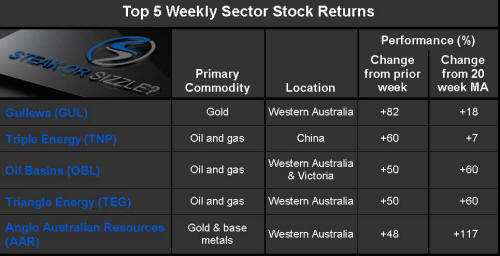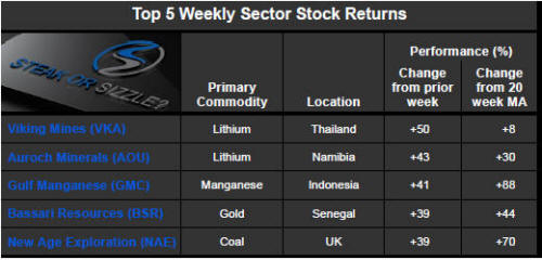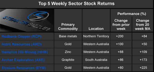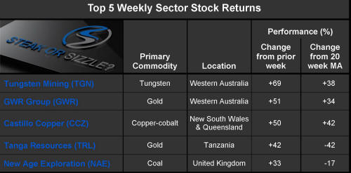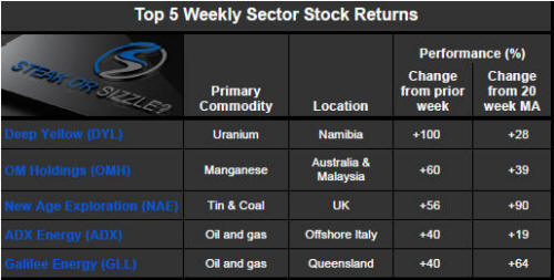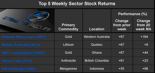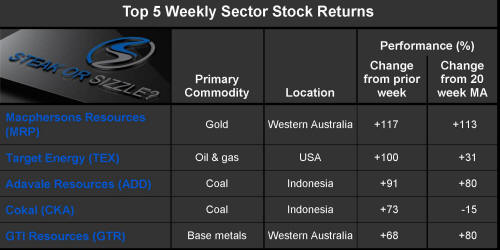 The �Steak or Sizzle?� blog comments on each of the top five performing resources stocks in the prior week.