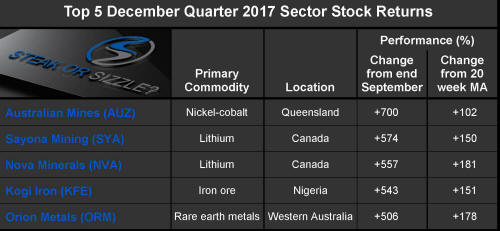 Fe announced that it had commenced drilling at a property in the Democratic Republic of the Congo prospective for copper-cobalt mineralisation. The company had purchased the property in November from Cape Lambert Resources (also among the best five performing stocks during the month), its largest shareholder with a 45% interest. The company had reported cash assets of $232,000 at the end of September 2017 with only $3,000 allocated to exploration expenses in the December quarter. At the end of December, the company announced that it was about to undertake a placement to raise up to $1 million at a price which would be 59% below the price at which its shares had last traded. Verdict: Sizzle.
