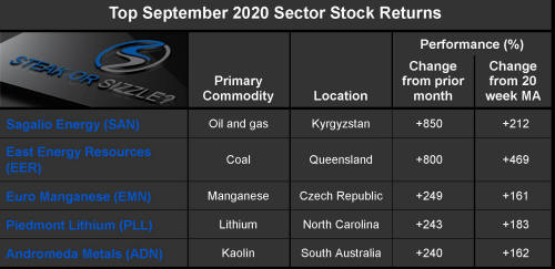 During 2019, eight additional companies produced returns from the start of the year greater than the 419% recorded by the company with the fifth highest return over the entire year. The eight companies were Warrego Energy (+950%), Liontown Resources (+650%), Meteoric Resources (+618%), Stavely Minerals (+610%), Tietto Minerals (+485%), Fenix Resources (+465%), Laneway Resources (+433%) and Hot Chili (+420%).
