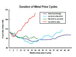 Time, of itself, is not important but the sequence of adjustments which are typical of a commodity price cycle and contribute to changed prices and expectations does take time. A more detailed analysis of metal price cyclical duration is available here. The downswing phase of a cycle has an average duration of approximately 20 weeks.