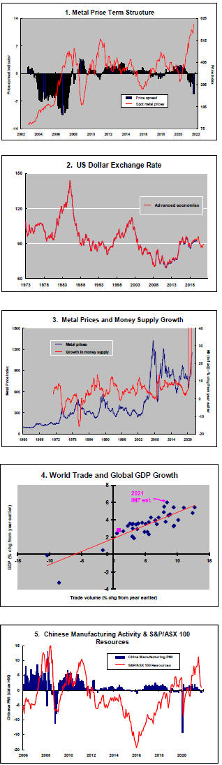 The greatest danger to a metal price cycle comes when monetary policy settings begin to tighten in response to higher inflation with an adverse effect on output growth and investment spending.
