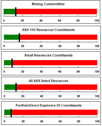 With a median decline in prices of ASX-listed resources companies since the beginning of 2011 of 89% (and 30% of companies suffering a decline of more then 95%), the majority of stocks remain prone to strong 'bottom of the cycle' leverage in response to even slight improvements in conditions.