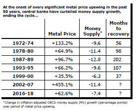 In previous cycles, authorities have moved to stem monetary growth rates while metal prices have been on the rise, sometimes quite aggressively, in an effort to prevent the rise of inflation pressures. The tightening in policy has typically cut short price cycles.