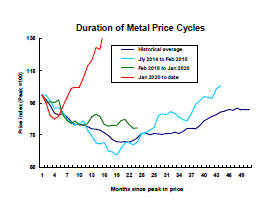 Time, of itself, is not important but the sequence of adjustments which are typical of a commodity price cycle and contribute to changed prices and expectations does take time. A more detailed analysis of metal price cyclical duration is available here. The downswing phase of a cycle has an average duration of approximately 20 weeks.