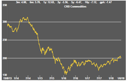 The CRB index had returned to levels last experienced in 2015. The general upswing in commodity prices had been given added impetus by stronger crude oil prices which have eased back, taking the CRB commodities index lower over the past two weeks.