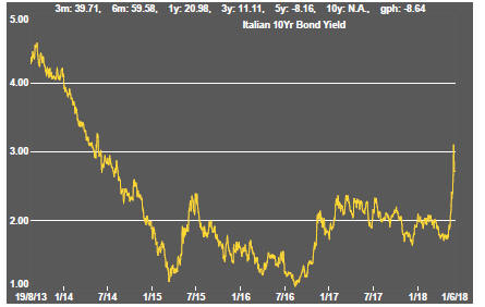 The decline in yields is at odds with the relative strength of the US economy but linked to the flight to safety as a result of the Italian political impasse. German yields were also lower as Italian political parties appeared unable to form a new government. Yields reversed late in the week as disagreements in Italy were papered over in response to threats of a new election.