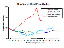 Time, of itself, is not important but the sequence of adjustments which are typical of a commodity price cycle and contribute to changed prices and expectations does take time. A more detailed analysis of metal price cyclical duration is available here. The downswing phase of a cycle has an average duration of approximately 20 weeks.