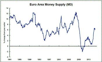 Certainly, money supply will grow fastest if demand for funds is also on the rise as it was during the 2000s until 2008. The current money supply growth trajectory suggests that Europe's central bank may be doing its bit but that the real economy is not yet responding in a way which is consistent with a significant improvement in growth prospects beyond recent outcomes.