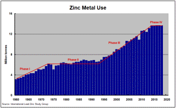 The International Lead Zinc Study Group has reported that zinc usage has not changed significantly since 2014 with 2019 usage on track to come in lower than five years ago. Despite unusually slow growth in metal usage, market balances have been kept in check by declines in mine output and refined metal production.