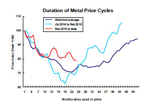 The red line, based on a cyclical peak having occurred in February 2018, had been tracking the average of historical cycles to the end of January 2019. The subsequent deviation from the average has reduced the depth of the cyclical decline but the timing of the shallower than average cycle remains close to average durations..