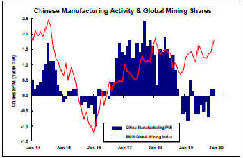 Chinese manufacturing had enjoyed a prolonged expansion since early 2017 which helped build positive sentiment for investments in the mining sector (as illustrated in the fourth chart in the right hand panel and the view below of the most recent five years).