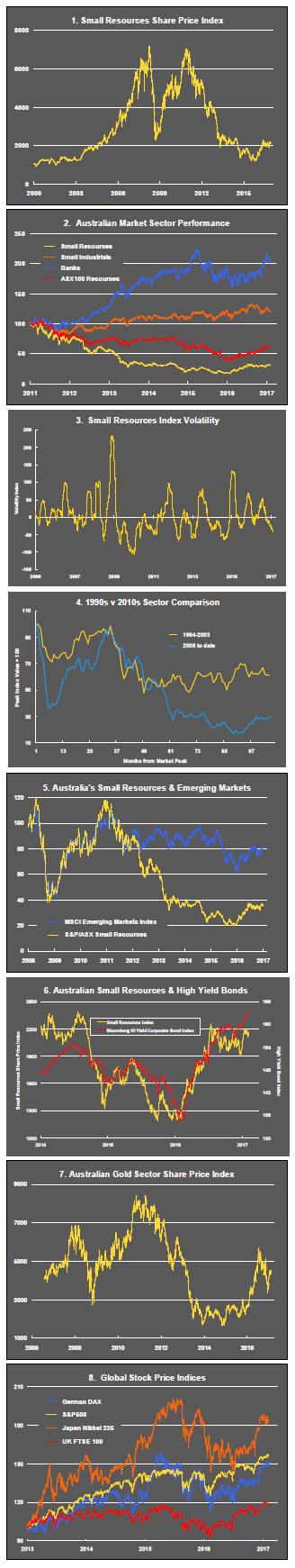 The small resources share price index shown in the first chart in the right hand panel remains stuck around its early 2015 levels despite a more favourable risk environment and the continuing uptrend in the prices of the larger stocks in the sector.