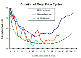 Using the prices of the six main daily traded base metals - aluminium, copper, lead, nickel, tin and zinc - the blue line in the chart shows, for the nine price cycles since 1960, the profile of the average adjustment following each cyclical price peak.