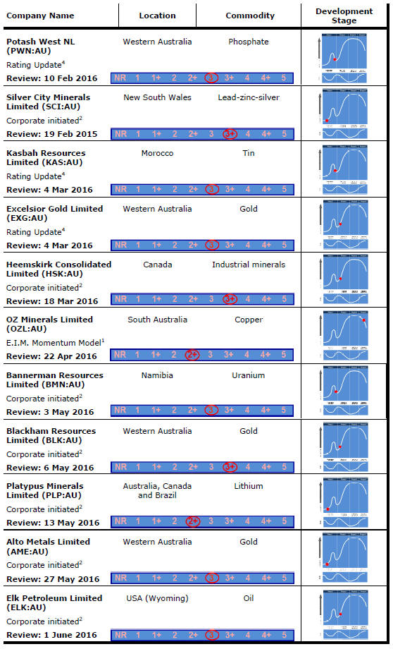 Stocks with relatively low ratings are regarded as more risky (i.e. less likely to achieve their exploration or development goals over a reasonable investment time horizon) than those with relatively high ratings.