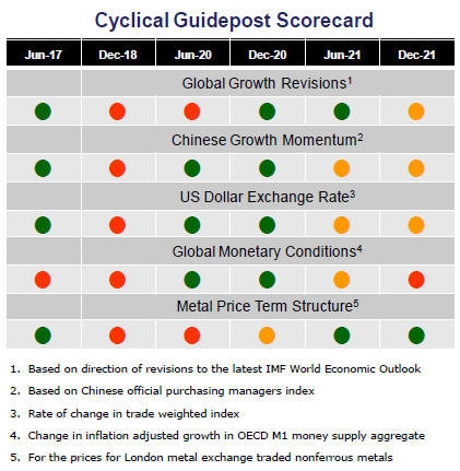 Through February 2016, the first signs of cyclical improvement in nearly two years started to emerge. The metal price term structure reflected some moderate tightening in market conditions and the guidepost indicator was upgraded to ‘amber’ pending confirmation of further movement in this direction.