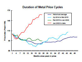 Time, of itself, is not important but the sequence of adjustments which are typical of a commodity price cycle and contribute to changed prices and expectations does take time. A more detailed analysis of metal price cyclical duration is available here. The downswing phase of a cycle has an average duration of approximately 20 weeks.