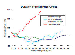 Time, of itself, is not important but the sequence of adjustments which are typical of a commodity price cycle and contribute to changed prices and expectations does take time. A more detailed analysis of metal price cyclical duration is available here. The downswing phase of a cycle has an average duration of approximately 20 weeks.