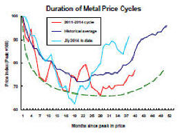 Using the prices of the six main daily traded base metals - aluminium, copper, lead, nickel, tin and zinc - the blue line in the chart shows, for the nine price cycles since 1960, the profile of the average adjustment following each cyclical price peak.