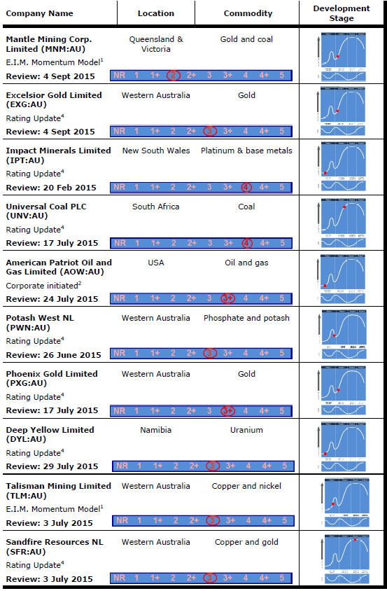 Stocks with relatively low ratings are regarded as more risky (i.e. less likely to achieve their exploration or development goals over a reasonable investment time horizon) than those with relatively high ratings.