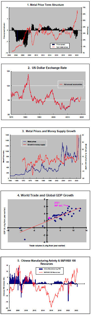 The greatest danger to a metal price cycle comes when monetary policy settings begin to tighten in response to higher inflation with an adverse effect on output growth and investment spending.