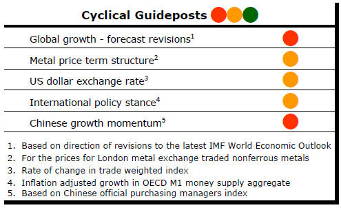 From mid 2014, the metal market cyclical position was characterised as ‘Trough Entry’ with all but one of the PortfolioDirect cyclical guideposts - the international policy stance - flashing ‘red’ to indicate the absence of support.